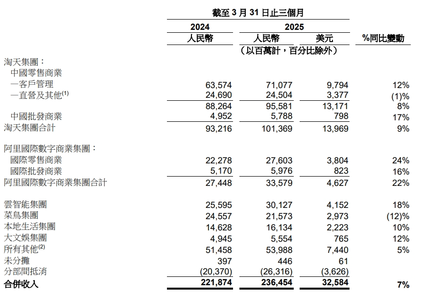 淘天集团收入为1013.69亿元,同比增长9%;利润417.49亿元,同比增长8%;阿里国际数字商业集团收入为335.79亿元,同比增长22%;亏损35.74亿元,亏损同比收窄13%;云智能集团收入为301.27亿元,同比增长18%;利润24.2亿元,同比大增69%;菜鸟集团收入为215.73亿元,同比降低12%;亏损6.06亿元,亏损同比收窄55%;本地生活集团收入为161.34亿元,同比增长10%;亏损23.16亿元,亏损同比收窄28%;大文娱集团收入为55.54亿元,同比增长5%;利润0.36亿元,扭亏为盈;所有其它收入为539.88亿元,同步增长5%;亏损25.35亿元,亏损同比收窄10%。