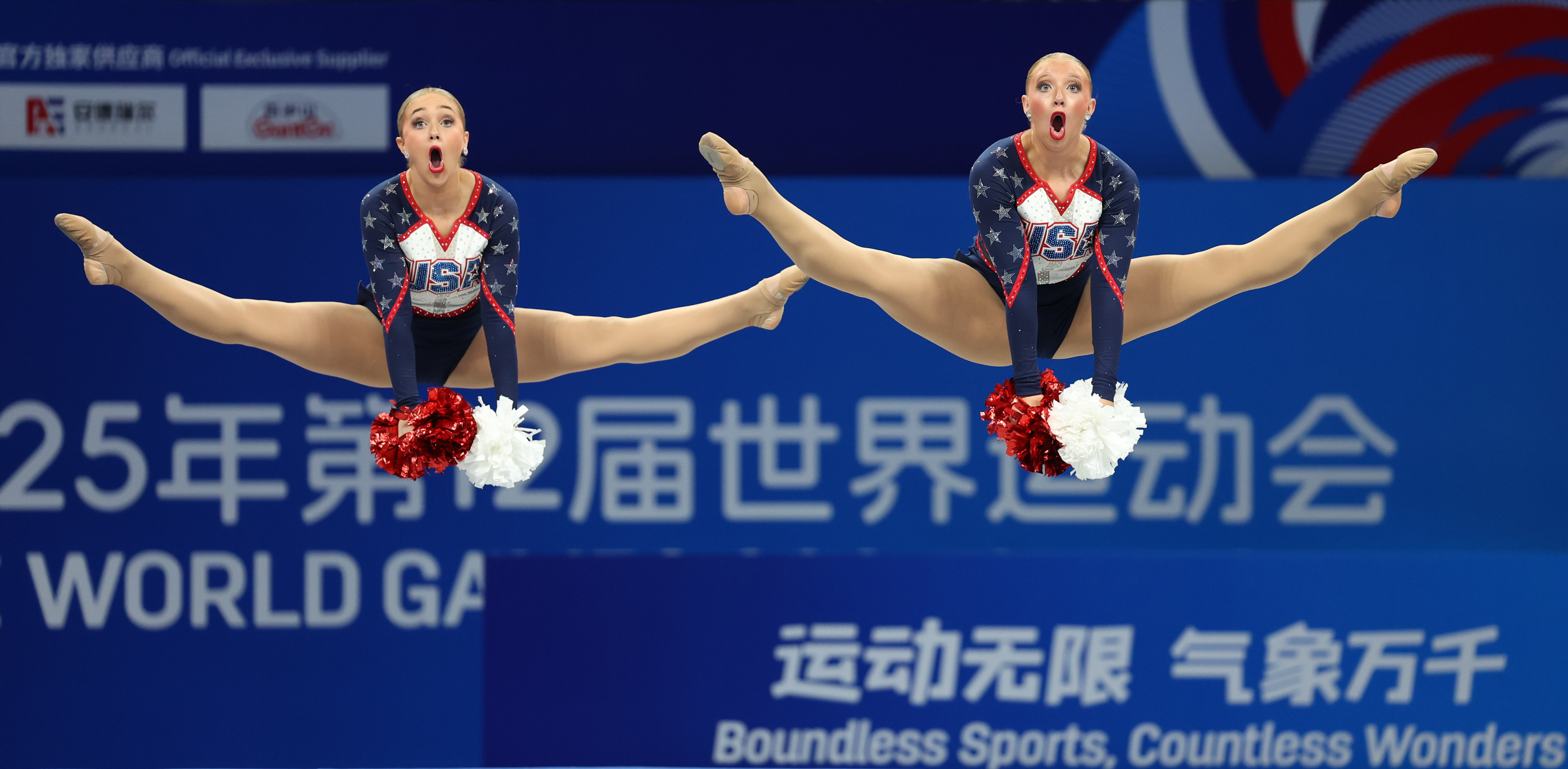 8月16日,美国组合赫夫特/马丁在2025年成都世界运动会啦啦操双人花球半决赛第二轮比赛中。新华社记者 梁旭 摄